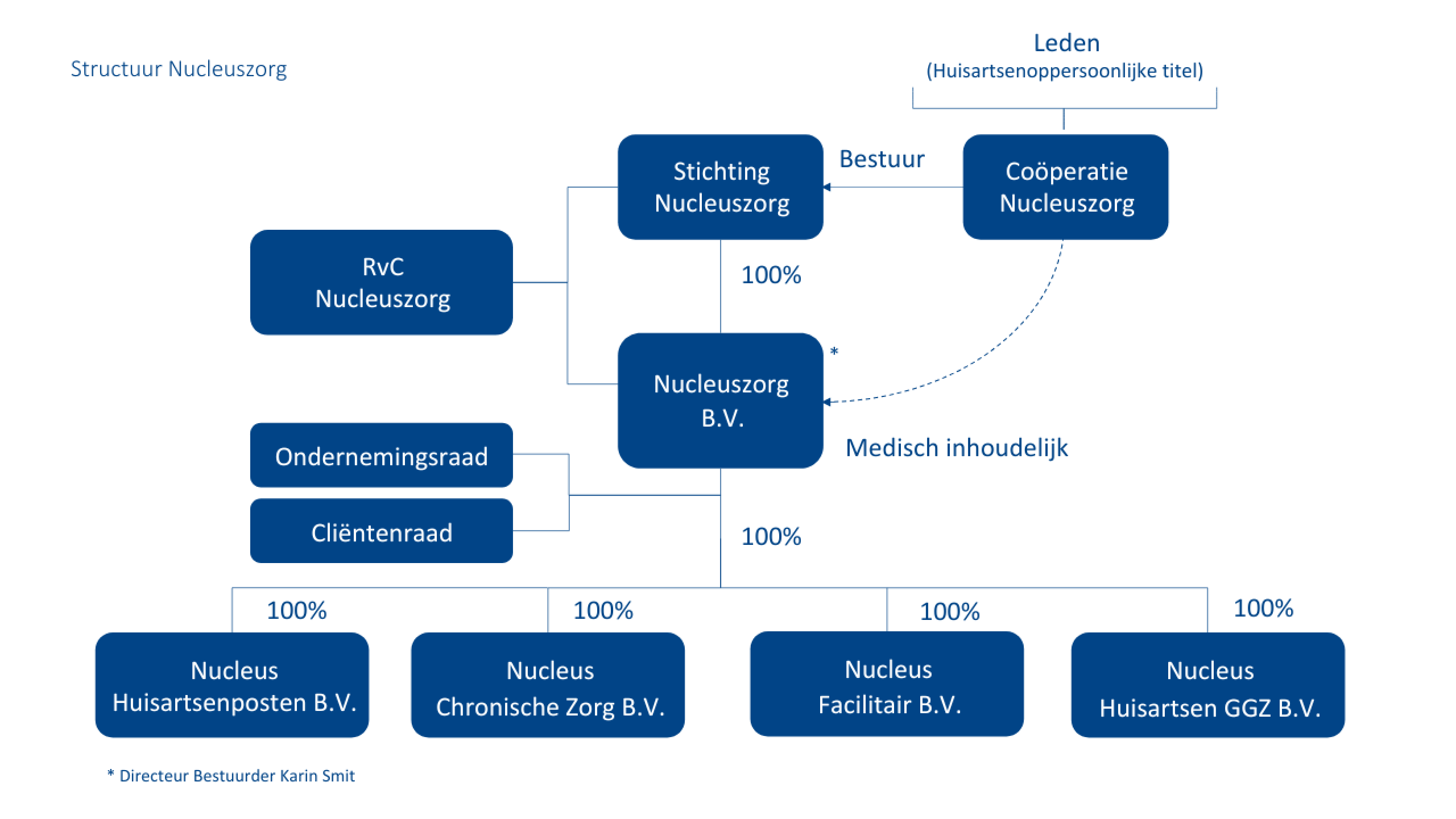 Coöperatie Nucleuszorg is door Stichting Nucleuszorg aangesteld als bestuurder. Het bestuur van Coöperatie Nucleuszorg is hiermee middellijk de bestuurder van Stichting Nucleuszorg.